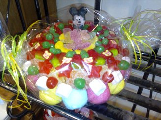 Nous venons d'ajouter à notre gamme de vente les gâteaux et bouquets de confiserie à offrir surtout pour les anniversaires d'enfants. Ils sont réalisés avec différentes friandises . Différentes couleurs sont possibles ainsi différentes figurines comme Mickey, Minnie, Cars,..... De préférence ces articles sont vendus sur commande ( 8 jours suffisent ). Nous en avons cependant toujours en stock.