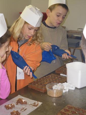Chaque petit chocolatier a moulé un moule de pralines différent. Après un passage dans le frigo, il fallait le remplir de praliné à l'aide d'une poche. Ouh la la, c'est plus facile à dire qu'à faire!! Après un deuxième passage dans le frigo, le démoulage pouvait avoir lieu, puis la mise en sachet. Chaque enfant a ainsi réalisé de A à Z une petite série de pralines, qu'il a ramenées chez lui pour dégustation, ainsi que le sujet en massepain enrobé de chocolat.