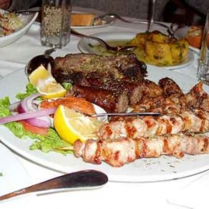 Notre coup de cœur gastronomique auprès d’un ancien étudiant du CERIA à Bruxelles (comme votre serviteur) est le restaurant Bakatsianos à Arnea. Le chef proposa des aubergines grillées traditionnelles, saladi politiki, pommes de terre au four au romarin, champignons farcis à la feta, agriogevroune (sanglier à la façon stifado, cuit aux petits oignons de Mulhouse, miel, canelle, poivre, girofle et vin rouge), côte de porc à la broche, saucisse Arnaia et soutzoukaki (viande hâchée).