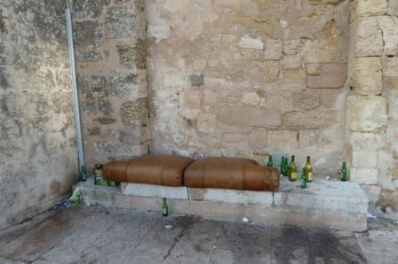 Plus que quelquefois dormir avant la fête de Noël. Marseille en décembre, et pourtant le temps est d’une extrême douceur, à s’attabler du matin au soir aux terrasses. Du café au pastis ! En sillonnant les rues et les quartiers, en cherchant à aller saluer la mer, mes yeux littéralement tombent sur un salon aménagé à ciel ouvert. Les sans domiciles de Marseille ont opté pour le confort : des coussins gonflés en cuir, adossés à la pierre de l’Eglise Saint- Laurent. Cadavres d’alcool, abandonnés. Les buveurs ont déserté le confort et le jour, ils doivent marcher dans les rues de la ville, à la recherche…