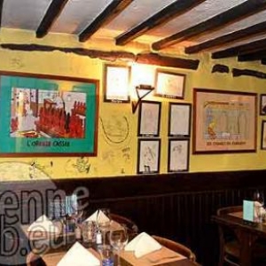 Dès l'entrée, l'histoire se met à parler. D'où vient donc cette taque en fonte dont les personnages nous sont inconnus, de même que les inscriptions du fronton ? Plus loin, un saint dans sa niche veille sur le bon aboutissement de nos appétits, tandis qu'en face de lui se dresse un personnage passablement impressionnant : Charlemagne? C'est fort possible. Mais à cette époque, tout le monde ressemblait à Charlemagne. La brique, et surtout le bois, sont les grands architectes d'un décor d'une amène rusticité. Les poutres sont dignes d'un Musée de la Vie Quotidienne. Deux pièces en enfilade, une mezzanine avec un vieux pupitre d'école, deux petites pièces d'un romantisme touchant, permettent à l'amateur d'opérer des choix avant de s'attabler, ou de prendre l'apéritif au bar aménagé au fond de la salle principale.