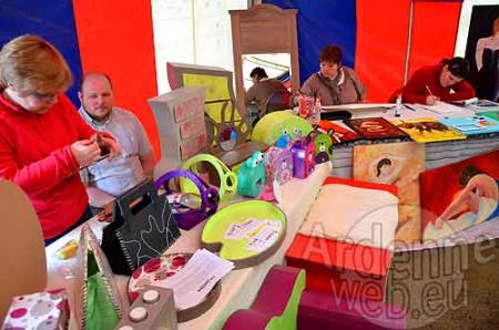 Avec des cartons d’emballage, Marie-Aline Bossicart, Sabine Jamotte , et Margot Youcken (prix du public) façonnent des fauteuils, des sacs à main, des armoires. Le tour de main, elles l'ont appris à un stage aux Z'Ateliers, à Houffalize,