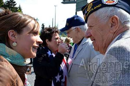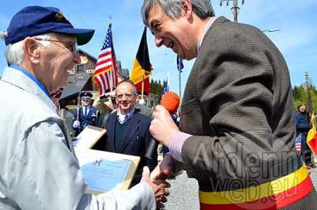 Aujourd’hui, nous avons une pensée émue envers tous ces hommes et plus spécialement vers ceux de la 106ème division d’infanterie dont nous avons l’honneur de recevoir aujourd’hui trois vétérans de l’unité. John Schaffner, John Gatens et John Swet, du 589ème bataillon d’artillerie : ils étaient à la Baraque de Fraiture.
