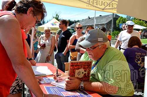 Sexagénaire en cette année du trentenaire de la brasserie d'Achouffe, le cofondateur Chris Bauweraerts était présent sous toutes ses facettes. Brillant brasseur certes, mais aussi auteur de My Chouffe story, un bouquin à la couverture de gueules (couleur émail rouge, en héraldique) présentant une centaine de paires de lèvres humectées à la blonde. Auteur de la musique et des paroles d'une ritournelle prositophile à bourrer tous les moûts, réchauffée sans cesse par le Dixieland Streetband sur un bitume à la limite de l'ébullition.