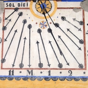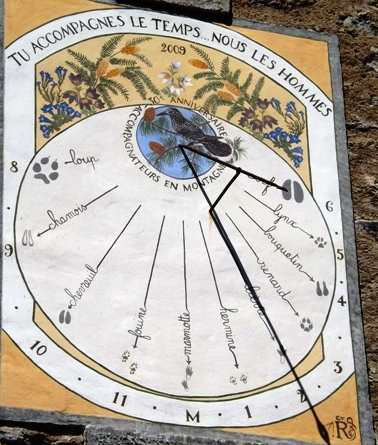 Les cadrans solaires étaient très répandus de la Renaissance au 19ème siècle. Sous forme de fresques ou de sculptures, illustrés de devises souvent en forme de sentence religieuse ou morale, les cadrans solaires sont de véritables œuvres d’art de la tradition populaire. De tous les départements français, celui des Hautes – Alpes compte le plus de cadrans solaires peints ( plus de 400 dont 284 datent d’avant 1914 ). Saint – Véran est le village qui détient le record du nombre. Les cadrans solaires sont porteurs d’enseignements et de messages. Dans les Hautes - Alpes, leur intérêt grandit avec les décors variés qu’ils offrent et par les différentes expressions artistiques employées. Les cadrans solaires mesurent l’heure solaire vraie, grâce à l’ombre portée sur le mur par le « style » ou « gnomon » ( du grec indicateur ). Il faut savoir qu’il y a environ 40 minutes de décalage entre l’heure solaire des Alpes et celle de Bretagne, alors que l’heure légale est la même partout en France. Ils ornent parfois des architectures classées monuments historiques et ont connu de nombreux styles ( Louis XV, Louis XVI, Empire. En montagne, on retrouve dans l’artisanat des cadrans solaires, les liens étroits qui unissaient les vallées alpines de part et d’autre de la frontière. Au 19ème siècle, l’Italien Giovanni Francesco Zarbula, maître de l’art gnomonique, crée des cadrans, à la valeur artistique, d’une grande originalité rappelant le style byzantin avec corbeilles de fleurs, oiseaux exotiques, dessins en trompe l’œil. Dans leur majorité, ils ont été peints directement sur un enduit frais ( a fresco )avec des pigments naturels ( ocre jaune, rouge d’oxyde de fer, terre de Sienne, noir d’os calcinés, vert d’oxyde de chrome, .. ). Un cadran solaire ne peut donc être lu qu’en présence du soleil ; Il ne se trouve pas nécessairement sur la face sud d’une maison. Il peut également être créé sur la façade est et ouest. Ce sont soit des cadrans du matin, soit des cadrans de l’après -midi. Dans de rares cas, on peut en trouver deux sur la même maison pour avoir toutes les heures ensoleillées de la journée. Depuis une vingtaine d’années, les initiatives de sauvetage et de restauration se sont multipliées.