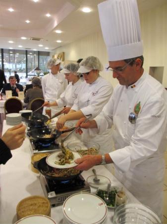 Quelle belle expérience, nous voici à l’Ecole hôtelière de Namur. Ici, au contraire de Groene Poorte et CERIA il ne vous sera pas possible de réserver une table pour l’un de vos repas. Si un jour vous aurez la chance d’y être invité vous y croiserez que des jeunes gens – étudiants qui, pour citer Mr Francart, jouent une pièce où chacun à son rôle. Aujourd’hui ‘client’ et demain ‘serveur’ ou, bien encore, maître d’hôtel … Et là, tout autour, omniprésents, les professeurs. Et dixit, madame la Directrice : ‘C’est une évaluation en temps réel et en continu. On y apprend le respect de soi, le respect des autres et, bien sûr, des clients. Mais une chose est sûre la cordialité et la politesse de tous ces jeunes gens est impressionnante – ce ne sont pas bien évidemment des extra-terrestres mais au jour d’aujourd’hui… Donc comme ‘l’Ecole’ ne vous est pas ouverte en route pour l’hôtel-château sis à moins de 200 m. Ici aussi ‘nos’ étudiants passerons et trouveront face à de vrais clients. Alors, juste un avis strictement personnel et ce malgré le visage gastronomique du restaurant et l’expérience du chef JM Préaux veuillez à ne pas oublier que les jeunes gens qui vous servirons votre repas, excellent en l’occurrence, ne sont que des élèves (en année terminale) et que la petite faute est toujours possible. Le jour où ils opèrerons dans une grande maison cette remarque ne sera plus de mise.