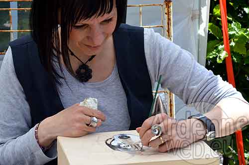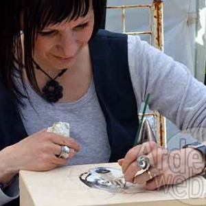 Nicole Misson-Crustin (Séviscourt - Libramont Chevigny). Une merveille pour les pique-assiette. De ses doigts de fée elle colorie des porcelaines vierges avec des pigments qui se fondront dans la matière initiale, sous l’effet de son four à 800 degrés.