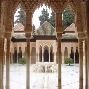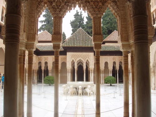La reconquête de Granada date de 1226. L’Alhambra, premier site touristique d’Espagne, accueille plus de 3 millions de touristes chaque année. En arabe, son nom signifie « la rouge ». L’Alcazaba, construction la plus ancienne de la colline, est entourée de robustes remparts défendus par de hautes tours. Dans tout édifice arabe, le patio est la pièce principale. Le patio des Arrayanes présente un grand bassin dans lequel se mirent la tour de Comares et les sept arcs en stuc. Le palais des Lions était la résidence privée des monarques que Muhammad V avait fait construire au dernier tiers du XIVe siècle. Le palais s’ordonne autour d’une cour qui présente 124 colonnes fines et stylisées. Le palais de Charles Quint est un des monuments Renaissance les plus impressionnants d’Espagne. Le Generalife (le jardin de l’architecte, en arabe) domine l’Alhambra. Cette magnifique propriété de villégiature accueillait les monarques nasrides durant les mois les plus chauds de l’année.