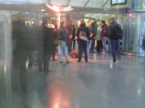 Dans la salle des pas perdus actuelle, qui n’en est pas une, de salle, puisqu’en fait une fois franchie la porte, on se trouve dans un espace ouvert par les nombreux escaliers et escalators menant aux quais, il n’y pas même pas deux sièges pour s’asseoir côte à côte ! Juste un rebord en marbre -froid comme de la pierre !- aux pieds des piliers, où l’inconfort est total et où on se tourne à moitié le dos.