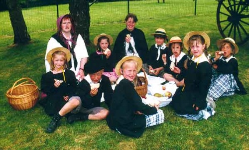 Des écolières chaussées de leurs bottines, tabliers noirs et longues robes. Espiègles et souriantes sous la conduite de l’institutrice. Vous pourrez suivre leurs leçons avec attention.