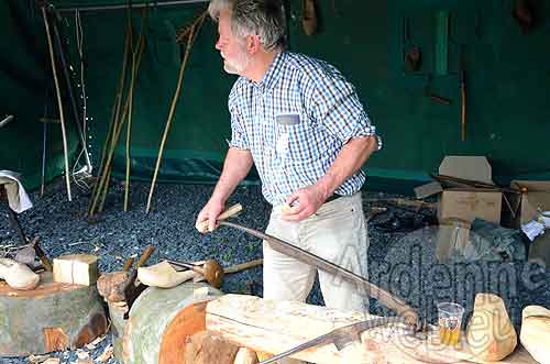 Un sabotier créant une chaussure à partir d’un bloc de hêtre encore tendre.
