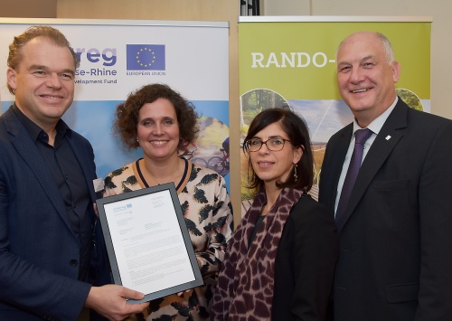 L‘Eifel Tourismus a transposé cet exemple sur l’ensemble du réseau cyclable. A côté de l’itinéraire qui part d’Aix vers Trèves, d’autres parcours entre Roermond et Luxembourg, entre Dusseldorf et Trèves ou encore entre Cologne et Trèves en traversant l’Eifel sont tout à fait possibles. Le concept a un potentiel non négligeable, reliant les pays et qui sera une vraie plus-value pour l‘ensemble du réseau cyclable dans toute la région Ardenne-Eifel. Les parcours vont être promus par la méthode du storytelling (raconter des histoires) et commercialisés avec la collaboration des établissements et partenaires touristiques le long des sentiers. Nous pourrons dès lors répondre aux souhaits, et même aux aspirations, des vacanciers à vélo, les toucher avec des histoires authentiques et leur donner des raisons concrètes de choisir précisément ces sentiers cyclables-là. L’objectif n’est donc pas seulement l’itinéraire entre Aix et Trèves, mais plus encore de relier des sentiers cyclables de qualité, les promouvoir, et donner à nos hôtes l’impression profonde d’être un roi et de vivre quelque chose d’extraordinaire. En guise de clôture du Kick Off Meeting, M. Mark Vos, Coordinateur administratif Interreg œuvrant dans les coulisses de l’Eurégio Meuse Rhin à Maastricht, a remis aux partenaires la « Grand Letter », laquelle assure le soutien du projet par des fonds européens, pour les 3 prochaines années, par un montant de 803.000 euros.