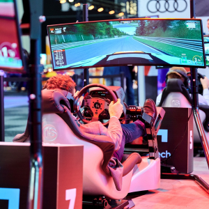 … Mais revenons aux voitures, qui elles aussi nous proposent différents simulateurs, dont, au « Palais 6 », pour la course automobile, 12 simulateurs « eSport », d’un haut niveau professionnel, de la firme « The Sim Power ».