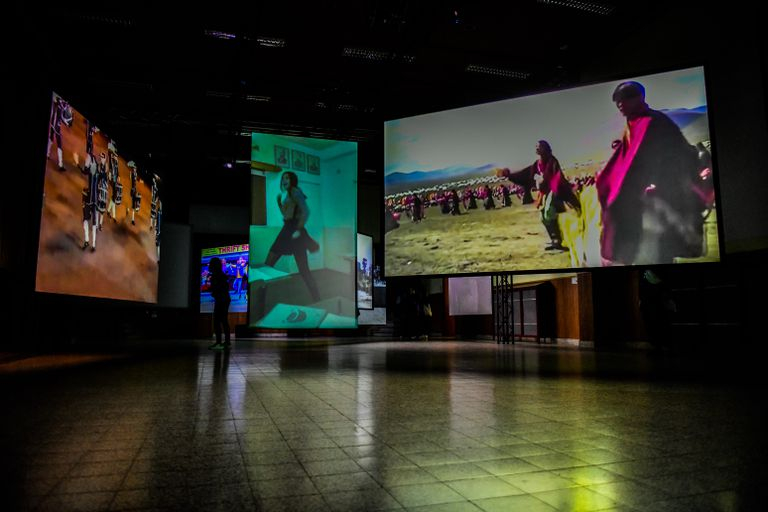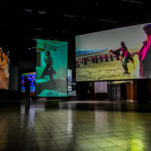 ** « Universal Tongue » (« Langue universelle »), dans une salle de gymnastique de l’ « Institut des Soeurs Notre-Dame », une installation cinématographique et musicale d’Anouk Kruithaf, nous rappellant le caractère universel de la danse, qu’elle soit classique, folklorique, hip hop ou autre, une programmation de … 30 heures, projetées sur 8 grands écrans, … authentique tour du monde de la danse, langage universel par excellence.