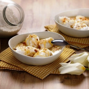 5/ Versez la crème refroidie dans un plat, posez délicatement les îles dessus. Parsemez-les d’amandes torréfiées.