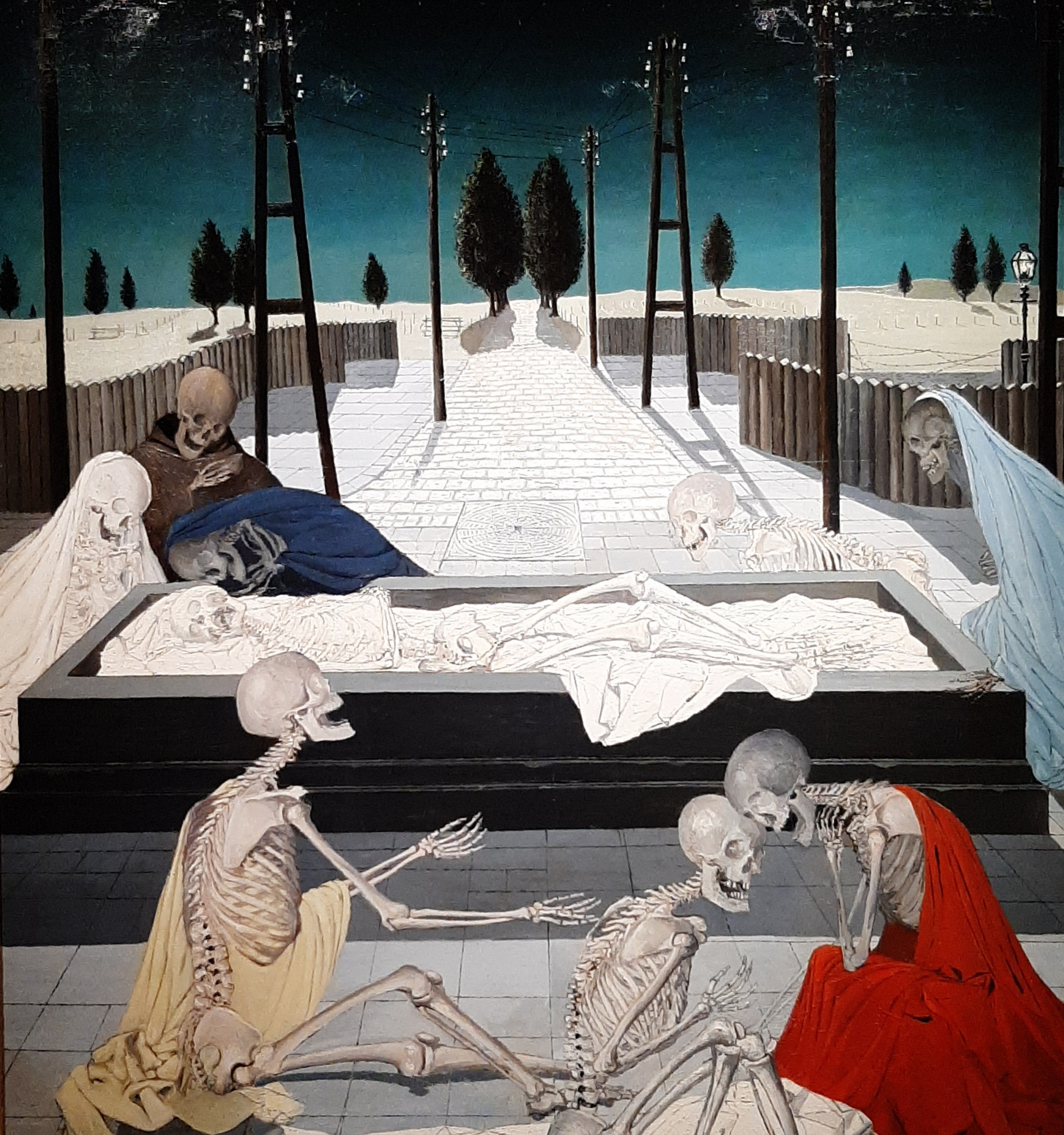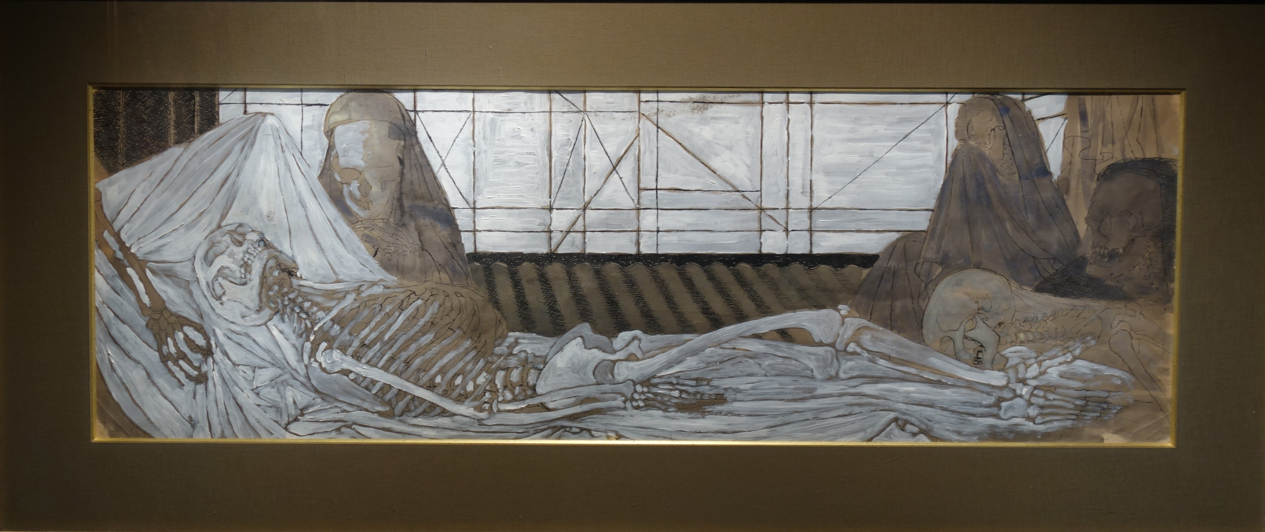 Au sein de cet espace, où d’anciens bancs de quai de gares nous permettent de récupérer quelque peu, nous pouvons admirer, outre 4 projets, 6 huiles sur toiles : « Chrisis » (1967), « Coiffeur pour Dames » (1933), « La Gare forestière » (1960), « La Mise au Tombeau » (1957, exposé avec son projet de 1953), « La Vénus endormie » (1932, avec trois projets, en fusain sur papier) & « Le Canapé vert » (1941), des oeuvres que nous pourrons retrouver au « Musée Paul Delvaux », à Sint-Idesbald– Koksijde, dès sa réouverture, le samedi 30 mars.