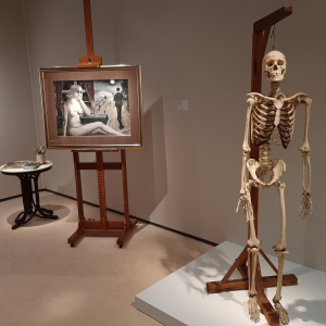 En dehors de son stand, mais toujours à la « BRAFA », nous retrouvons la « Fondation Paul Delvaux » sur le stand de la « Royal Chamber of Art Dealers » (N° 052), qui a reçu, en prêt jusqu’au dimanche 04 février, outre 4 oeuvres de Paul Delvaux – « La Terrasse » (1979), « La Robe mauve » (1946), « Les Adieux » (1964), « Etude Squelette » (1949) -, un squelette, « Oscar », qui se trouvait dans son atelier de Boitsfort, ainsi que, sous vitrines, plusieurs carnets de croquis et une illustration inédite pour un « Château Mouton Rotchild » (1985), ainsi que nombre d’objets lui ayant appartenus : képi et sifflet de sous-chef de gare, wagons et rails miniatures, un timbre-poste belge (1963), …