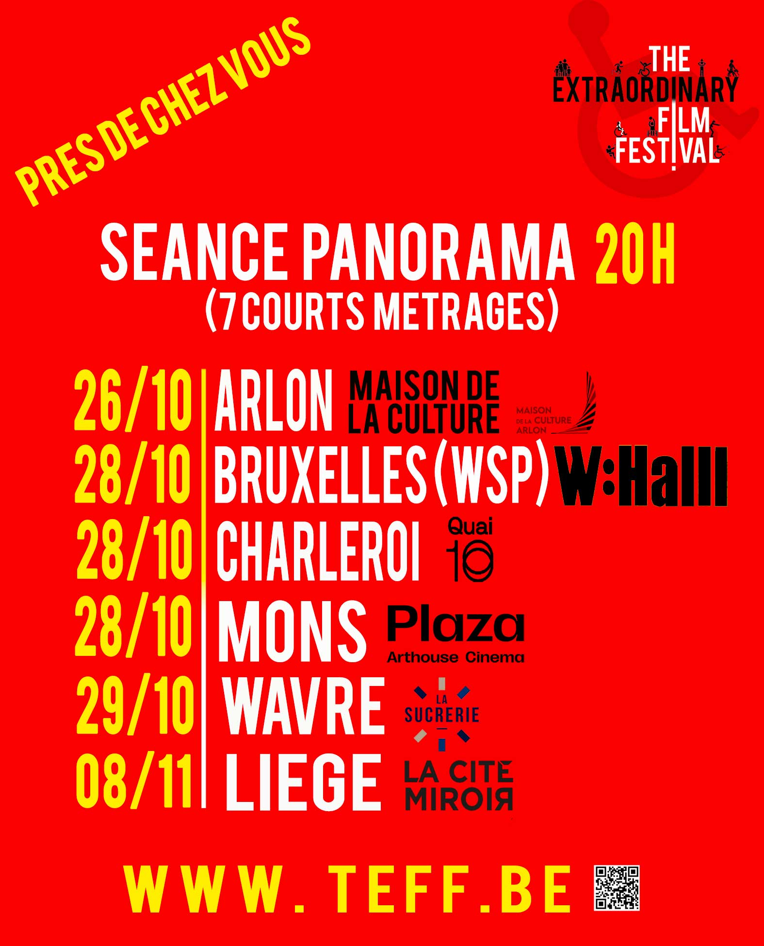En avant-première du 6è « The Extraordinary Film Festival », programmé au « Delta », à Namur, du mercredi 10 jusqu’au dimanche 14 novembre, une séance, présentant 7 courts-métrages, est programmée dans six de nos villes (Arlon, Charleroi, Liège, Mons, Wavre et Woluwe-Saint-Pierre), entre le mardi 26 octobre et le lundi 08 novembre.