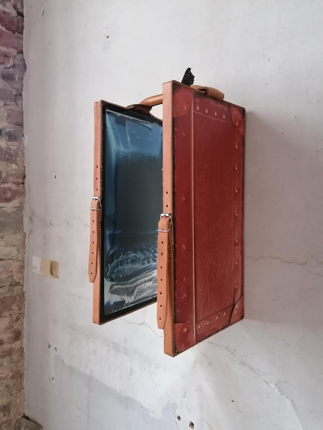 Exposant ensemble dans une autre chambrette, nous retrouvons les oeuvres de deux des fondateurs de « Vis-à-vis », André Lambert et Jacques Patris, prêts à voyager vers d’autres aventures artistiques, tous deux exposant, notamment, leurs valises, celle d’André étant peinte sur une toile, avec une poignée en cuir, alors que celle de Jacques, « L’Absente » (2012), est une création en 3D, garnie de photographies.