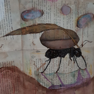 Ensuite, Bilal Bahir (°Bagdad/1988) – diplômé en sculpture de l’ « Institut des Beaux-Arts de Bagdad » – nous attend, lui qui, réfugié irakien, travaille à Namur, depuis 2010, où il poursuivit ses études à l’ « Académie des Beaux-Arts ». Ses oeuvres explorent la question des origines, des racines, un thème lié à son histoire personnelle, évoquant son exil de l’Iraq et le déracinement de ses valeurs culturelles et familiales. En découvrant son travail nous retrouvons des traces des contes de l’Orient, avec une dimension politique et surréaliste.