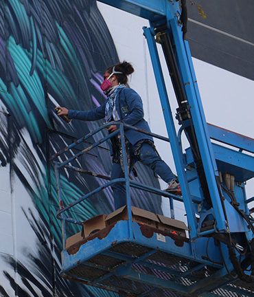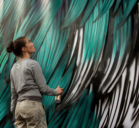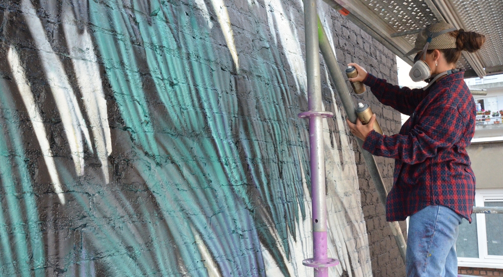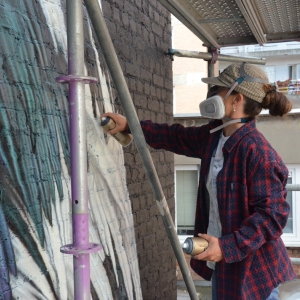 L’artiste Adele Renault, artiste liégeoise vivant à Los Angeles termine sa fresque commencée ce dimanche à Liège dans le cadre d’ART PUBLIC LIEGE. Elle peint un pigeon monumental Rue de l’Etuve à Liège.