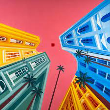 Sur un second écran des oeuvres, pleines de couleurs, de Maria Corte Maidagam nous sont présentées.