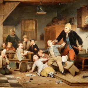 ** C-26 : « Remarkable Paintings » nous propose, entre autres, « La Leçon de Discipline », peinte, en 1861, par Ferdinand de Braekeleer, nous montrant – en notre époque de profonde remise en question de l’enseignement primaire en Fédération Wallonie-Bruxelles – à quel point l’éducation à l’école a évolué. Pas encore de smartphone, il y a 162 ans, mais bien la présence d’un bonnet d’âne, à gauche, et d’une brimade corporelle, à droite.