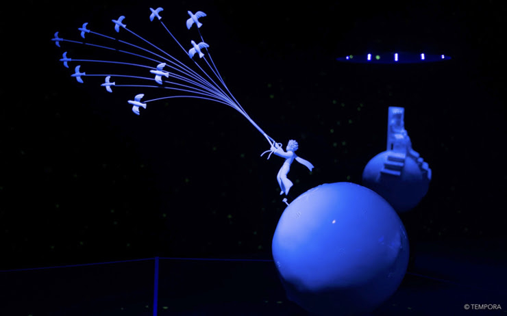 Nous évitant de terminer notre visite sur cette triste note, « Tempora » a eu l’excellente initiative de confier au  créateur tournaisien,multi récompensé pour ses spectacles urbains et autres événements, Luc Petit – fort de sa devise : « Je veux que les gens n’aient pas assez de leurs yeux pour tout regarder autour d’eux » –, la réalisation d’un espace immersif, où des livres géants, ouverts, prennent vie, durant douze minutes, dévoilant des images pleines de poésie du « Petit Prince », agrémentées d’un récit à écouter via notre audio-guide.