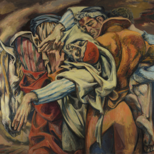 contexte contemporain, celui de la Seconde Guerre mondiale : le Samaritain porte un homme amaigri, affublé du costume rayé bleu et blanc des déportés et son regard exprime une intense bienveillance. La composition rigoureuse et équilibrée, la disposition minutieuse des corps et le rendu enveloppant des drapés concentrent l’attention du spectateur sur le visage émacié du déporté et par extension sur celui de son sauveur. »