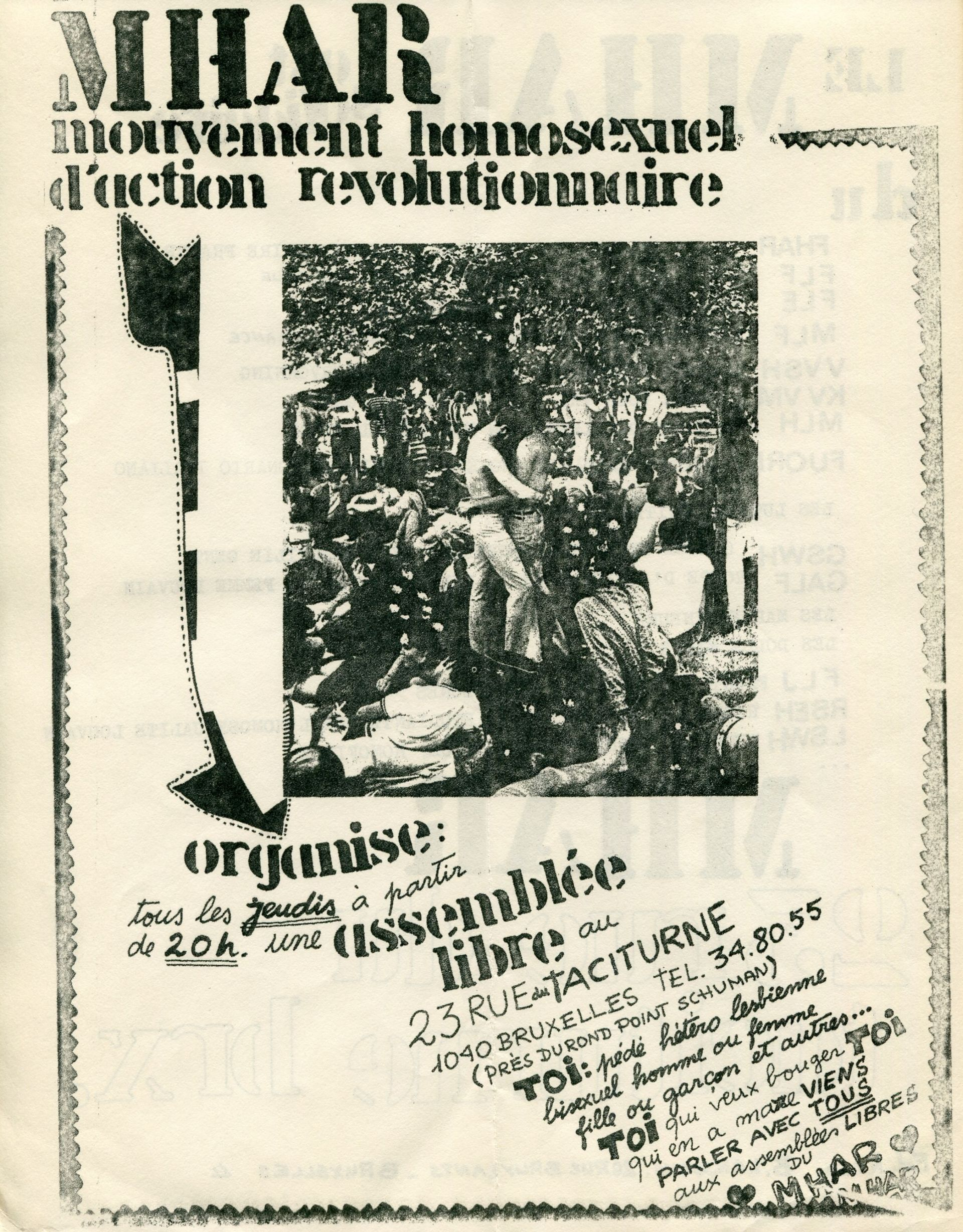 N’oublions pas qu’en 1965, l’article 372bis du Code Pénal belge éleva la majorité sexuelle, pour les relations homosexuelles. Aussi, les premières associations, essentiellement masculines, se limitaient, bien souvent, à offrir un espace protégé de rencontres. Ainsi, ce n’est qu’au lendemain de « Mai 68 », que sont apparus d’autres groupes , porteurs d’une autre vision du militantisme et de l’identité homosexuelle.