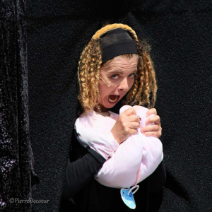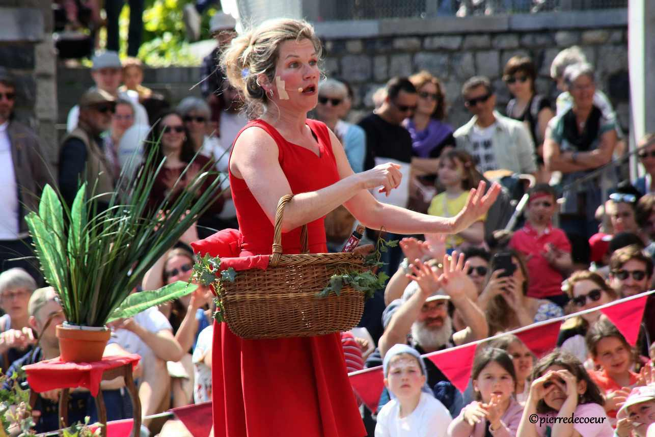 Présente en bord de Sambre, face aux marches d’accès au Centre culturel provincial « Le Delta », avec son comparse Alex Boriau, la comédienne belge Aurélie Frennet – détentrice d’un « Master en Interprétation dramatique », décerné à Louvain-la-Neuve, par l’ « IAD » (« Institut des Arts de Diffusion ») – est « La petite Chaperonne rouge » … Pourquoi pas, finalement, changer le genre du personnage principal de ce conte, créé par l’auteur français Charles Perrault (1628-1703), au sein de son livre « Histoires ou Contes du Temps passé » (1697).