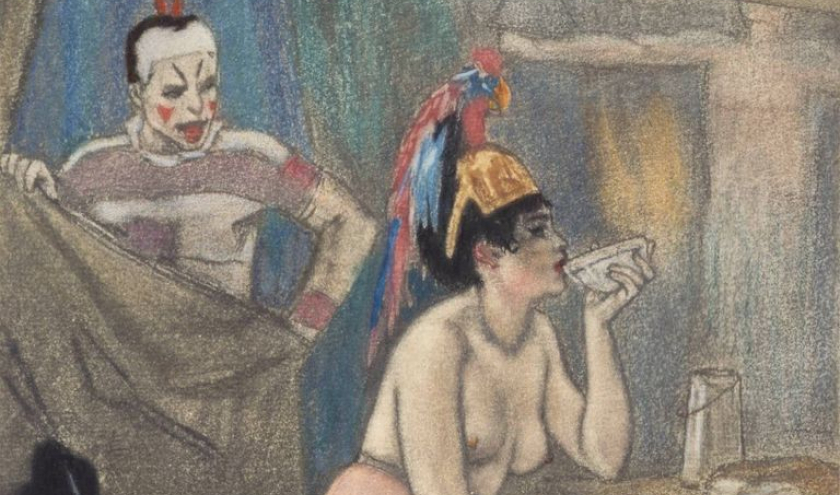 Un beau nombre d’oeuvres du XIXè siècle mettent en scène un clown, comme celles de Félicien Rops, issues de sa « Série des Cent légers Croquis », créée entre 1878 & 1881, dont le pastel, gouache, sur dessin à la pierre noire, « Vénus & Cupidon » ou « L’Amour bouché » (21,8 x 14,8 cm) et le pastel, crayon et aquarelle, « L’Entracte de Minerve » (22,5 x 15,5 cm).