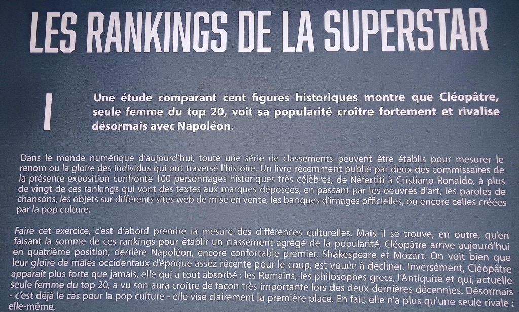 D’Elizabeth Taylor à Astérix & Obélix : Mission Cléopâtre, en passant par les clips musicaux et les jeux vidéo, Cléopâtre Superstar explorera ainsi les représentations multiples de ce personnage emblématique : femme fatale, souveraine puissante, figure espiègle. « Projections, extraits de films et installations ludiques permettent de décrypter les codes associés à chaque incarnation et de comprendre pourquoi Cléopâtre demeure une source d’inspiration pour des milliers d’artistes et de créatifs à travers le monde », concluent les organisateurs.