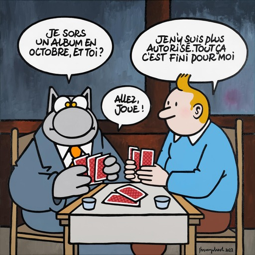 Présente à Ixelles et à Paris, la « Galerie Huberty & Breyne » (stand 54) nous accueille avec « Le Chat », de Phillippe Geluck, que nous découvrons, porteur d’une cravate, aux côtés de « Tintin », lui demandant, sur une toile : « Je sors un album en octobre et toi ? », le héros créé par « Hergé » (Georges Remi) lui répondant : « Je n’y suis plus autorisé. Tout cela, c’est fini pour moi. » « Le Chat » reprenant :« Allez joue. »