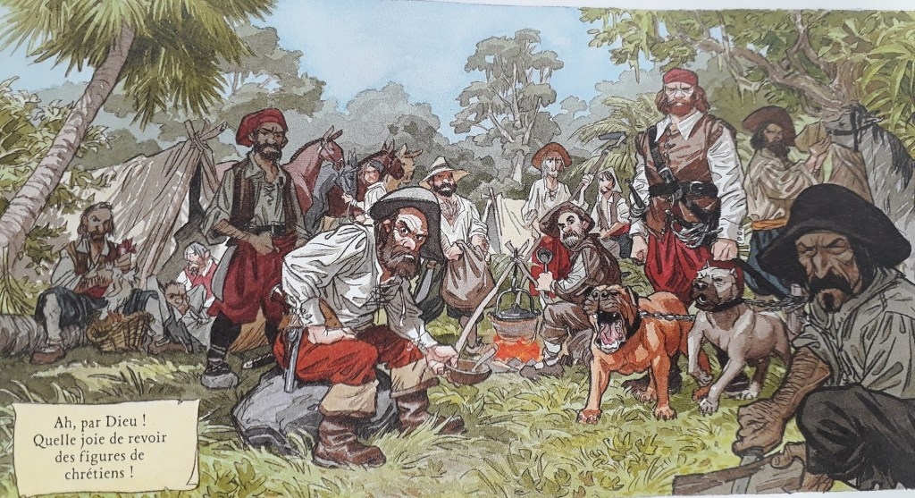 Revenons à l’exposition qui se poursuit avec un autre héros, Pablos de Ségovie, à une autre époque, au XVIè siècle, en d’autres lieux, en Amérique latine et en Espagne, avec un autre scénariste, le Français Alain Ayroles (°Saint-Céré/1968), et un autre éditeur, « Delcourt ».