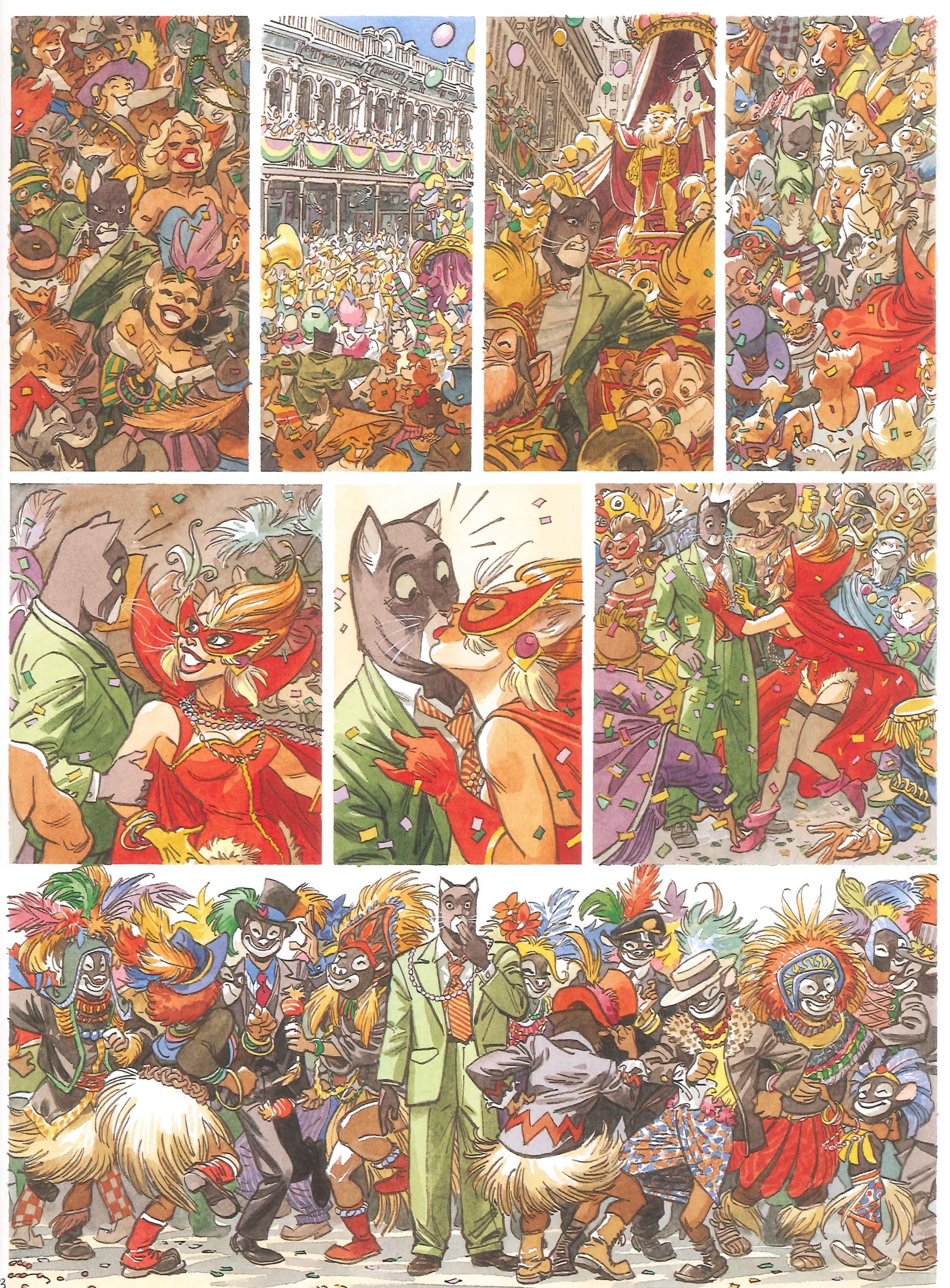 Au sein de l’exposition, la qualité du travail de Juanjo Guarnido est révélée, grâce à ses crayonnés, ex-libris et planches originales, exposés dans les différentes vitrines, notamment pour la réalisation du 4è Tome de « Blacksad », « L’Enfer, le Silence », édité, en 2010, par « Dargaud ». Alors qu’en 2021, nous n’avons connu aucun carnaval, ni en Belgique, ni en Louisiane, grâce à cet album et à la présente exposition, nous plongeons au coeur chatoyant du « Mardi-Gras » à New Orleans.