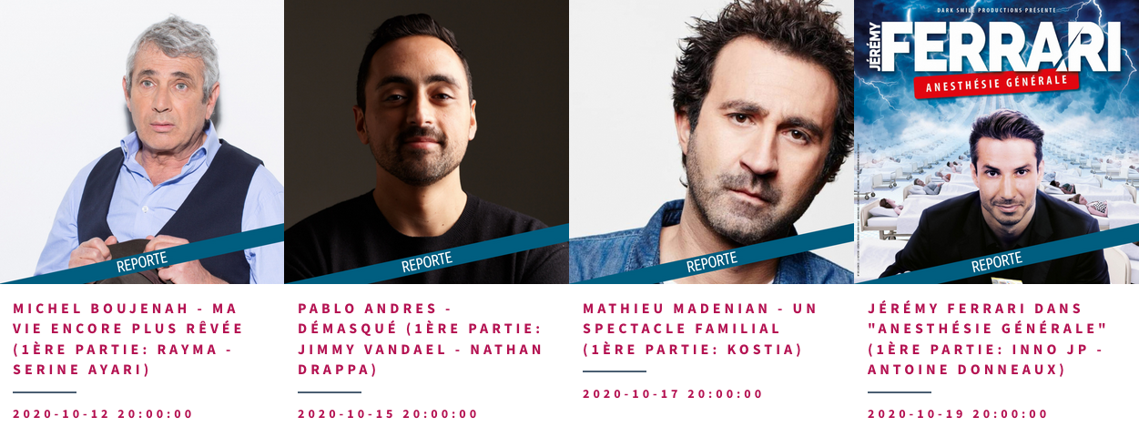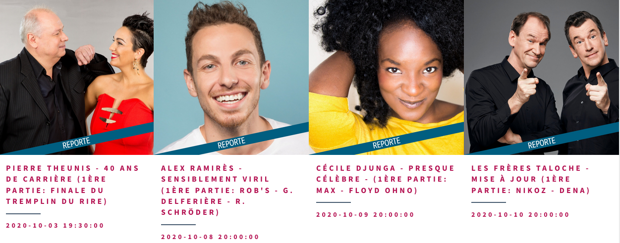 *Pour tous les spectacles reportés, vos tickets restent valables aux nouvelles dates qui vous sont communiquées sur notre site internet : www.festival-du-rire.be en cliquant sur le spectacle de votre choix. Conservez-les donc bien. Vous pourrez vous présenter avec ces tickets le jour de la représentation.