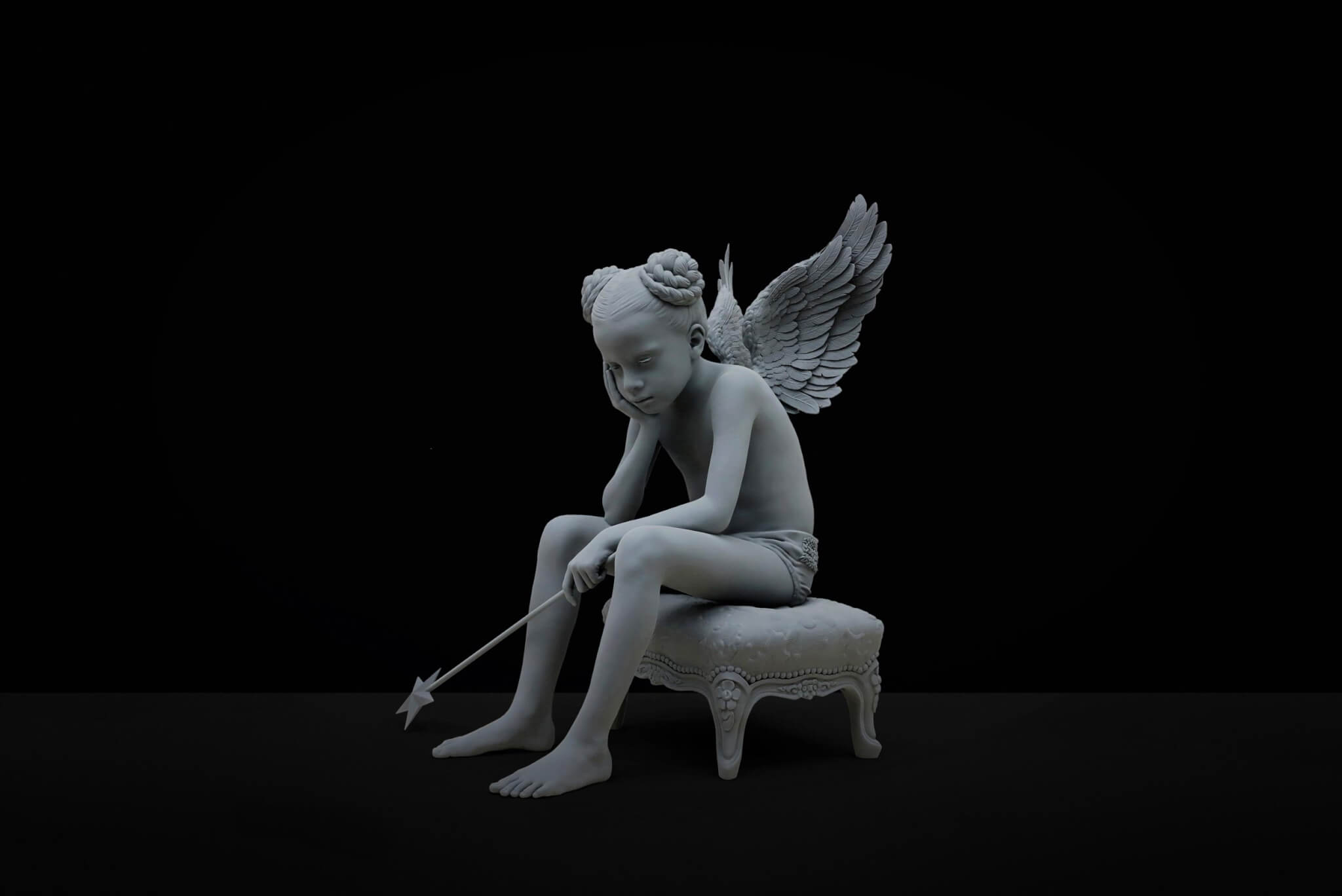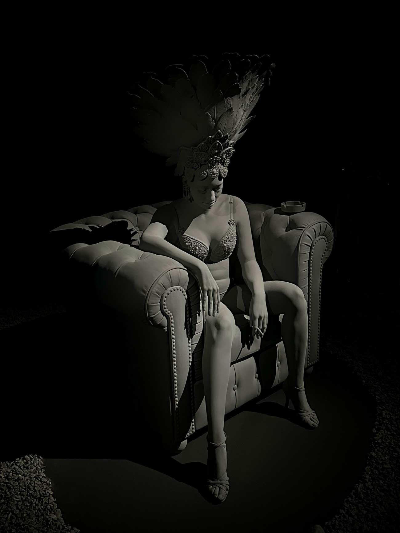 Un virage à droite et, assise dans son vieux fauteuil sculpté, nous trouvons « Danseuse » (2019), une Brésilienne, à l’imposante coiffe en plumes et en sous-vêtements de scène. Proche d’elle, une sculpture que nous avons particulièrement aimée, « Zhai Lisa » (2024), qui, ici, n’est plus un ange, mais bien un « petit rat de l’opéra » – bien différente de « La petite Danseuse de 14 Ans », créée par Edgar Degas (1834-1917) -, celle qui, tenant un éventail, plutôt que de « faire des pointes », porte les chaussures de sa maman.