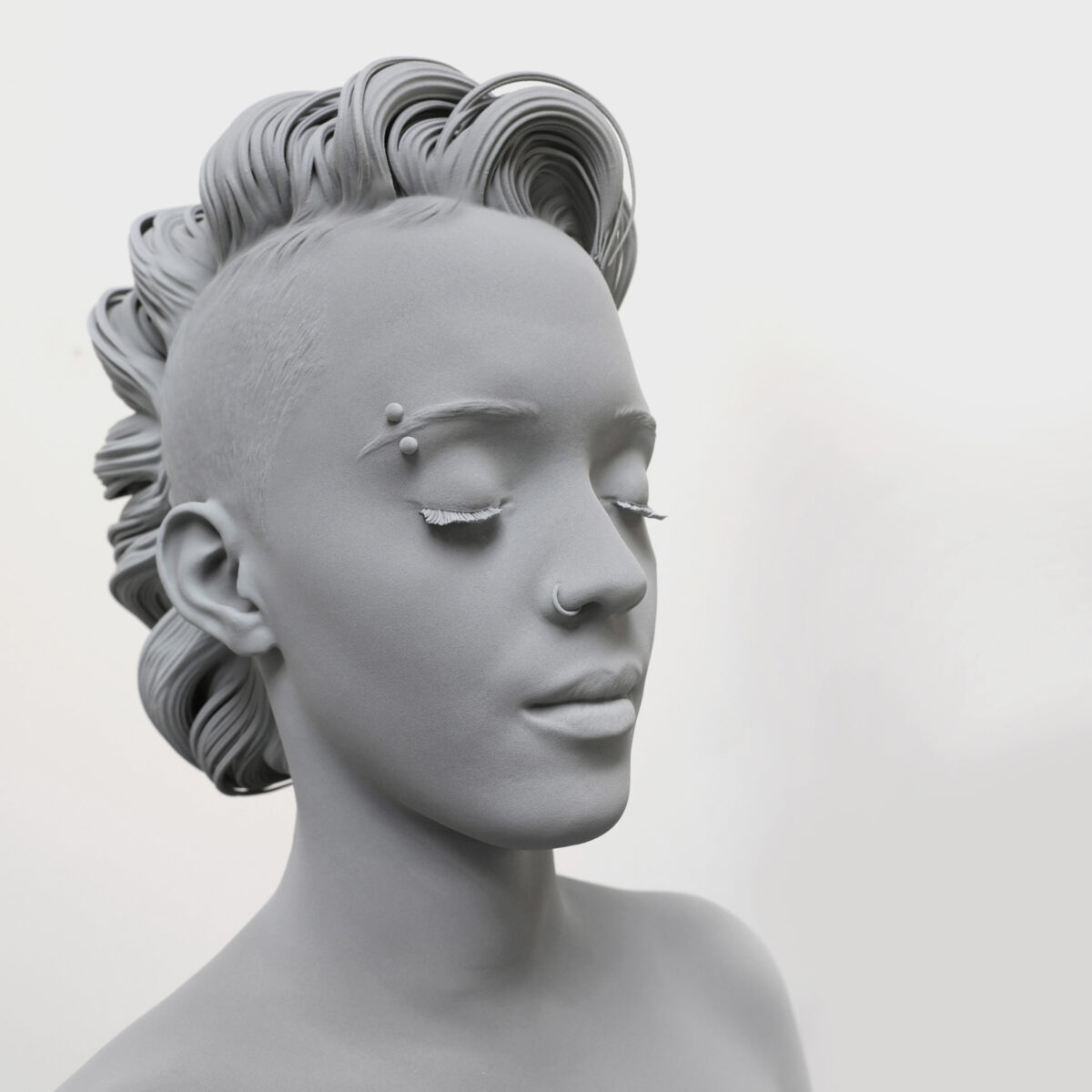 De l’autre côté, une nature morte en trois dimensions nous est présenté, avec un crâne morbide, posé sur un livre, derrière un autre livre, une poire et une grappe de raisins agrémentant « Vanités XL » (2021), alors qu’en quittant la salle, nous voyons « Lauren » (2016), une fillette perdue dans ses pensées, représentée en maillot de bain, tenant des ficelles entre ses mains.