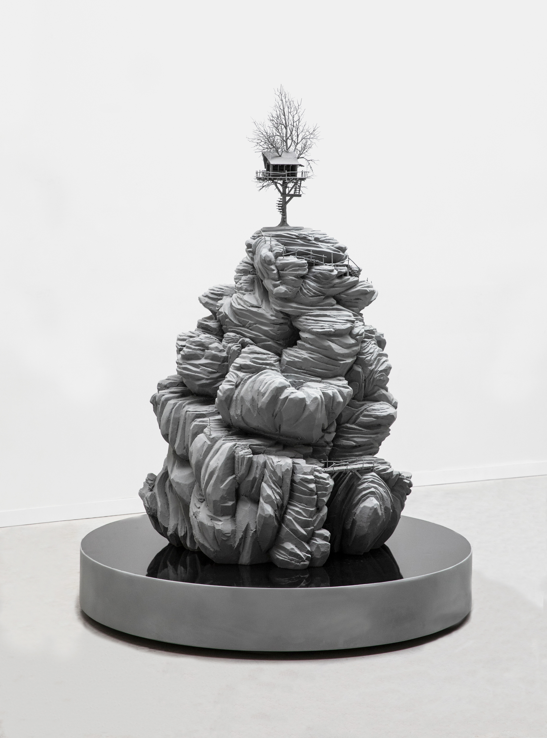 Créée à une échelle encore plus réduite, nous découvrons une cabane perchée dans un arbre, planté au sommet d’un rocher, immergé dans l’eau, sur laquelle se trouve un ponton et une barque minuscules, des marches, taillées dan s la pierre permettant d’accéder au sommet du rocher, cette sculpture s’intitulant « L’Observation des Etoiles » (2020).