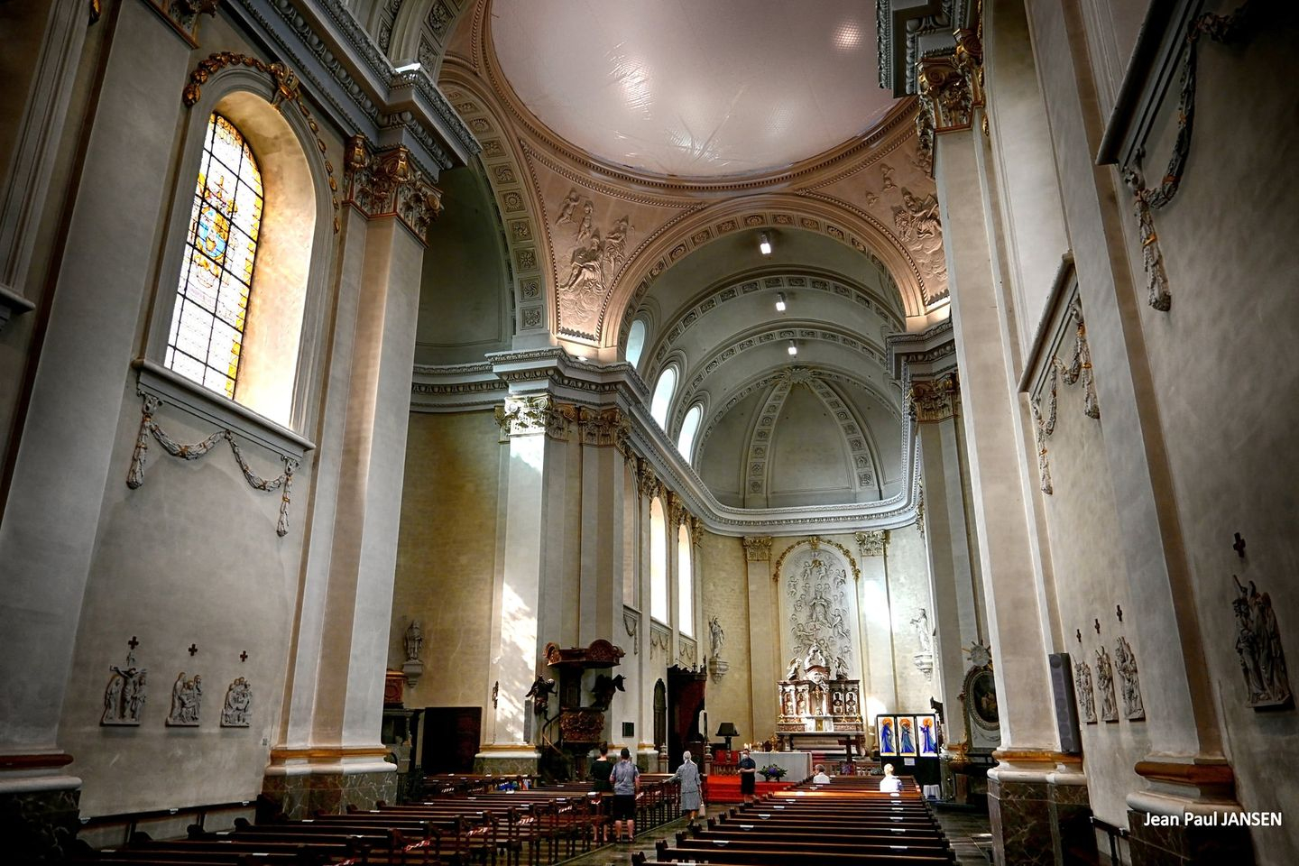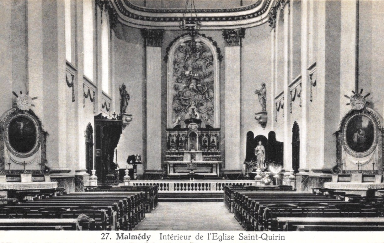 D’emblée, la majesté de ce lieu aux lignes pures et dépouillées vous en impose. Deux hautes tours carrées vous accueillent et vous invitent dans l’intérieur aux vastes volumes baignés de lumière. À l'intérieur, votre regard sera attiré par l’autel de la Sainte Vierge, en marbre, toujours d’origine, ainsi que ses quatre confessionnaux de bois sculptés et sa chaire de vérité. Si les vitraux ne sont pas d’origine (ils ont été détruits pendant les bombardements de décembre 1944), le carillon, lui, l’est bel et bien : construit en 1786, il est composé de 35 cloches authentiques, qui sont l’œuvre de Martin Legros, un habitant de Malmedy.