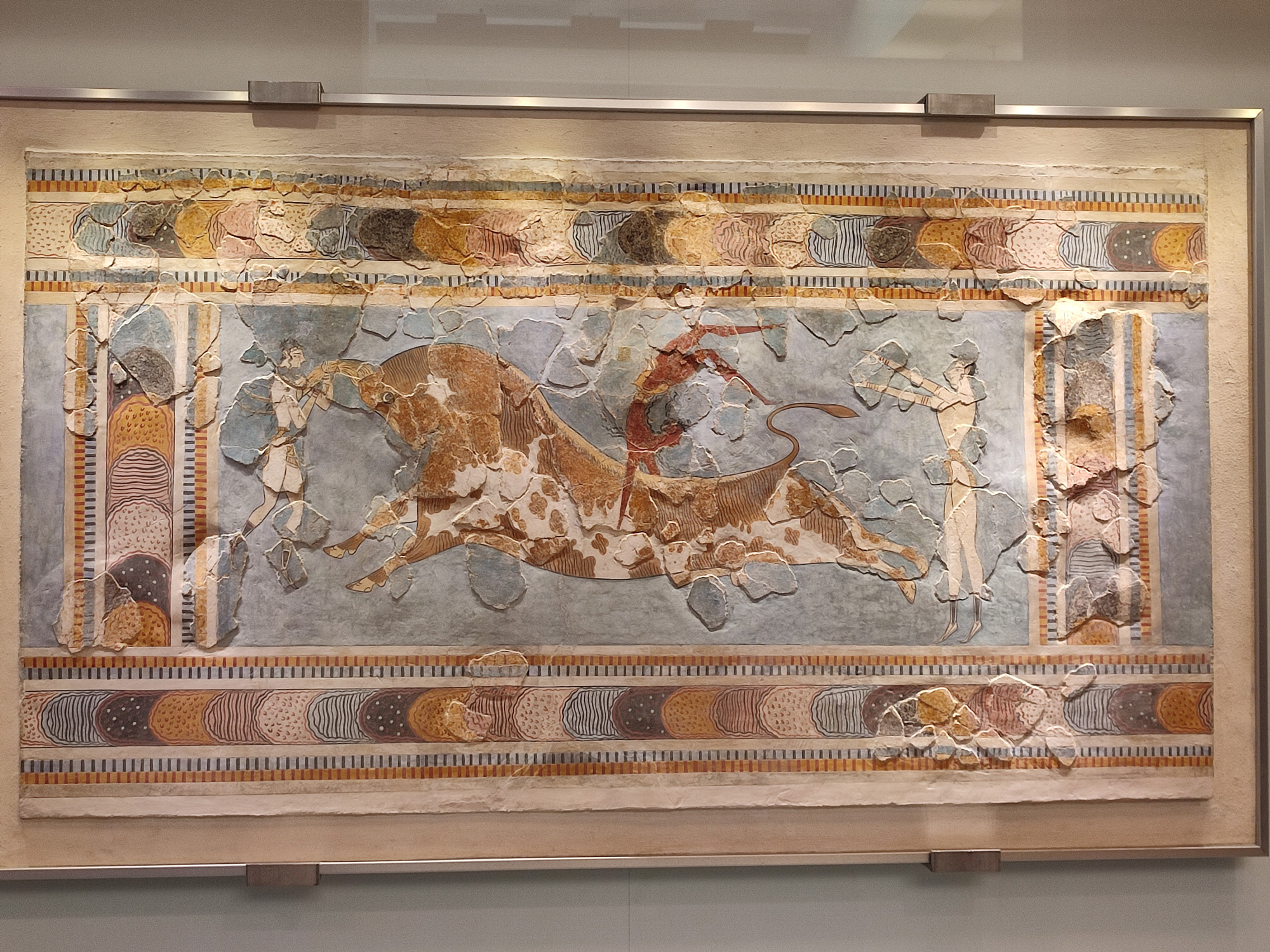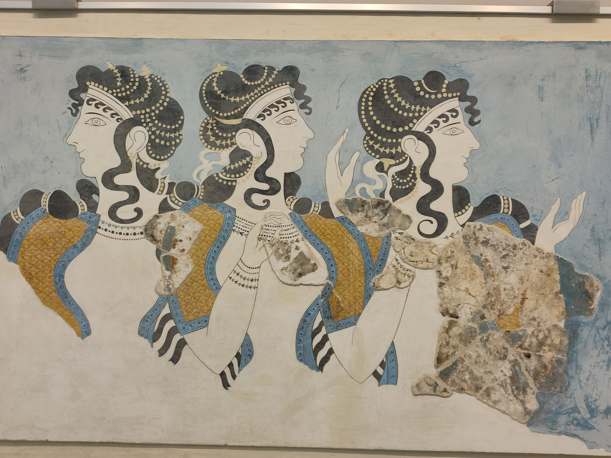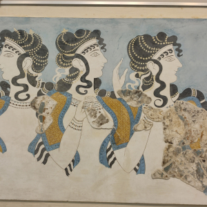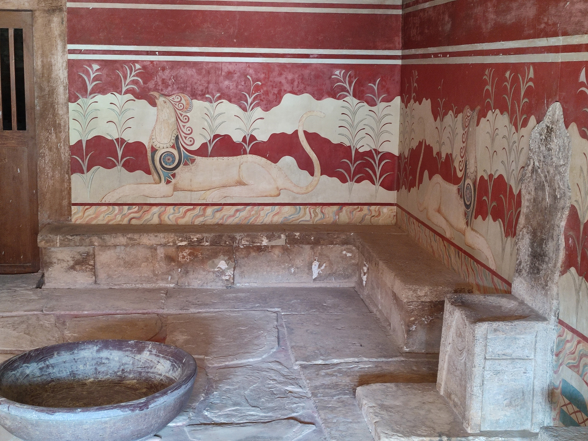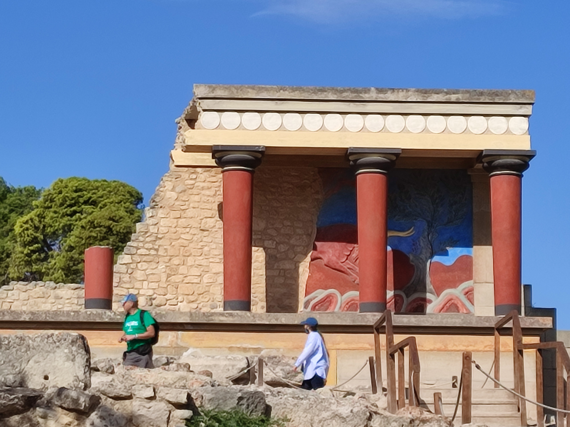 A 5 kilomètres de Heraklion, la capitale crétoise, se trouve le célèbre Palais de Knossos, du Roi Minos, découvert seulement au début du siècle dernier. Le terrain fut vendu à Evans en 1900 pour 10 000 livres sterling et les fouilles ont duré 4 ans. La structure du Palais de 23 000 m2 et 1 400 pièces comporte 6 étages. Le palais appartient à la dynastie de la plus ancienne civilisation d'Europe. Les Minoens commerçaient avec l'Egypte et l'Asie mineure. Les couloirs sont faits de pierre verte de schiste et de pierre blanche d'albâtre. Il n'y a pas de mosaïques mais des fresques, avec les femmes en blanc et les hommes en rouge. Une des pièces les plus connues est la salle du trône, avec le trône le plus ancien d'Europe, dont une copie se trouve au tribunal de justice de La Haye. Les griffons qui couvrent le mur de la salle ont la tête d'aigle, le corps du lion et la queue du serpent. Les Minoens, où la femme jouait un rôle important, étaient végétariens. Les Minoens ont construit un système de canalisations sur 50 kilomètres. Le plus vieux chemin d'Europe et le second au monde, après Sakkarah en Egypte, se trouve à Knossos.