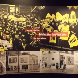 Le 29 mai, le président de la République, René Coty, fait appel “ au plus illustre des Français”. Le 1er juin, le général de Gaulle devient ainsi le dernier président du Conseil de la IVe République. Il reçoit des députés les pleins pouvoirs et œuvre pendant l’été 1958 à la rédaction d’une nouvelle Constitution, qui s’avère très proche des propositions avancées à Bayeux (exécutif fort). Les Français approuvent cette Constitution par référendum le 28 septembre 1958, avec 79,2% de “oui”. L’Empire l’approuve également, sauf la Guinée qui devient ainsi le premier Etat d’Afrique à obtenir son indépendance. Le 21 décembre 1958, Charles de Gaulle est élu président de la République française au suffrage universel indirect.
