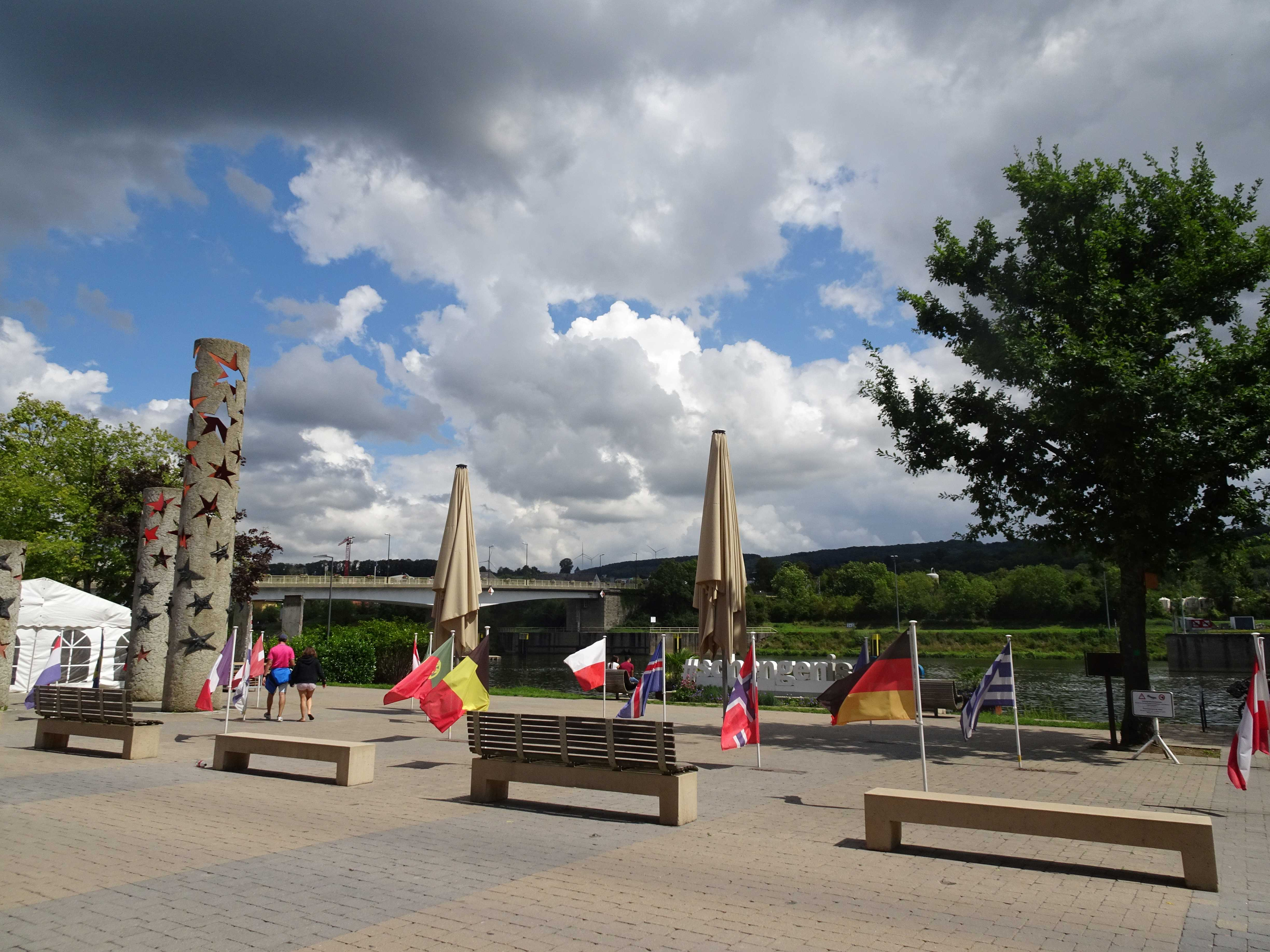 Face à la Moselle, se dresse le Monument Accord de Schengen, trois piliers en acier, comportant chacun une étoile en laiton, symbolisant les trois premiers signataires : l’Allemagne, la France et le Benelux. Des dalles de bronze représentent les pays membres de l’espace Schengen dont les noms sont indiqués dans leur langue nationale. A l'endroit dénommé « E Schlass fir Schengen », nous pouvons placer un cadenas à la sculpture étoilée avec notre nom à la lettre «B » de Belgique. Trois colonnes avec étoiles se dressent également près du Centre Européen. Sur l’un d’elles, le regard du visiteur belge est dirigé vers un Manneken Pis et l’Atomium en bronze.