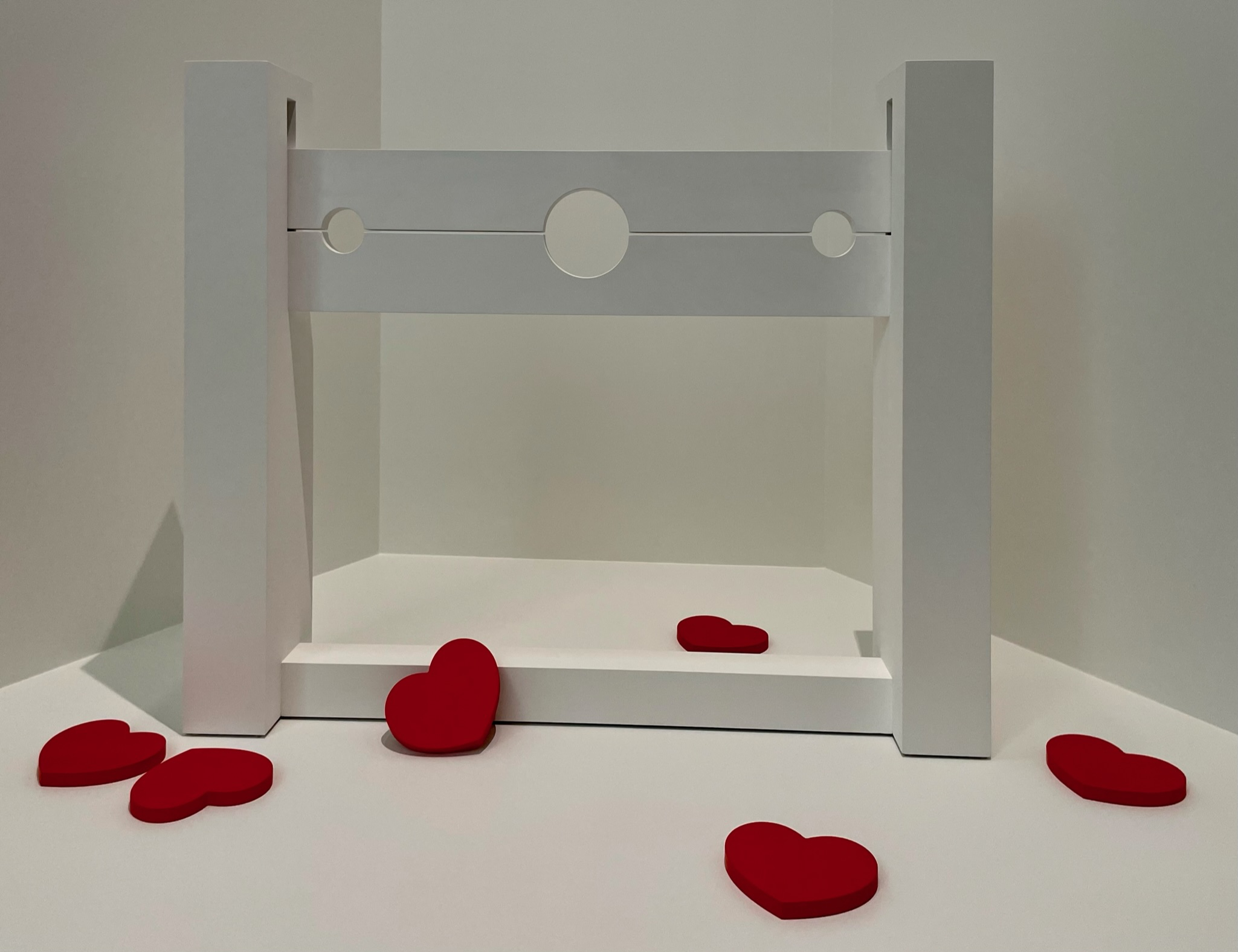 Originaire d’une ville industrielle du Nord de l’Angleterre, ayant poursuivi ses études d’art à la « Saint Martin’s School », à Londres, Luke Newton commence fort son exposition, avec une potence moderne immaculée, à la finition lisse et méticuleuse (« Like for Like »/2015), présentée avec des coeurs, opposant la notion d’amour à celle de la sentence, tout comme plus loin, ces mêmes coeurs sont posés près d’une guillotine (« Killing me Softly »/ 2019), toute aussi blanche et lisse, … avec le un titre curieux, en anglais, se traduisant par « Tuer moi doucement ».