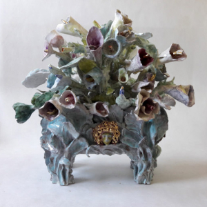 Après avoir expérimenté de nombreux médiums tels que le feutre, les livres d’artiste, le papier, la tapisserie, le vitrail, elle fait de la céramique son terrain d’exploration privilégié.