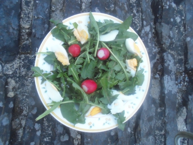 • Petite salade de lapin, trois radis, quelques morceaux d'œufs dur.