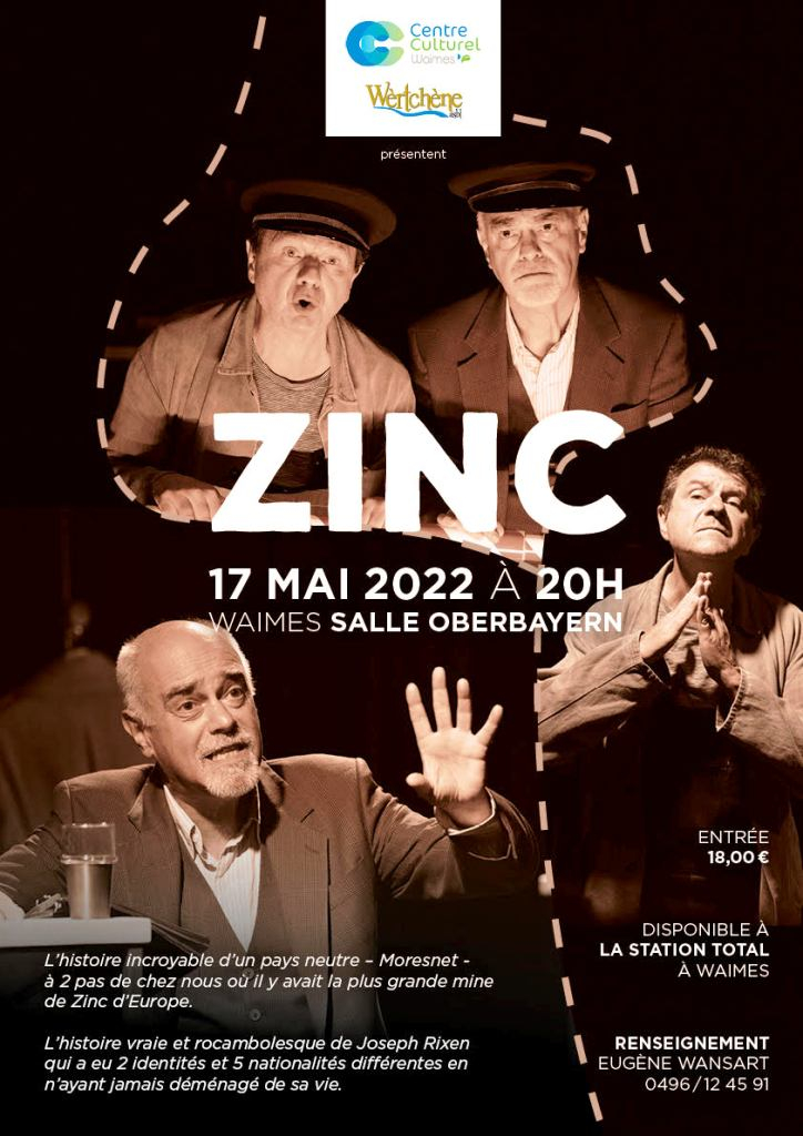 Le 17 mai : ZINC, une superbe pièce retraçant un épisode de la minuscule localité de Neu - Moresnet où habitait des membres de la famille Rixen, un nom très connu dans la région malmédienne.