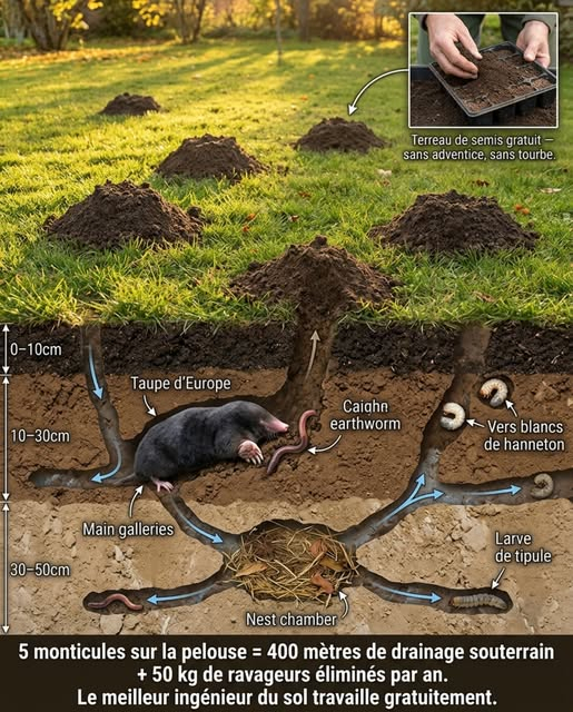 Les taupinières — ces monticules de terre fine que le propriétaire rase au râteau chaque semaine — sont le meilleur terreau de semis du jardin. La terre des taupinières est extraite des couches profondes du sol, finement émiettée par les pattes de la taupe et exempte de graines d'adventices (les graines germent dans les dix premiers centimètres — la taupe extrait la terre de 20 à 40 cm de profondeur, sous la banque de graines). Cette terre fine, sans adventice, à structure grumeleuse parfaite, est exactement ce que le jardinier achète en sac sous le nom de « terreau de semis » à 5 à 8 euros les 20 litres.