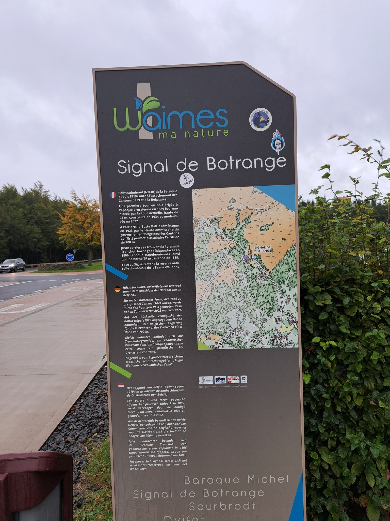 La nuit aux « Domaines des Hautes Fagnes » où Marceline était invitée ne m'a pas remis en forme mais Marceline n'y est pour rien. Départ du plus haut point de la Belgique, 693 m plus une butte crée pour atteindre les 700 m. Si Brel avait vécu chez nous, il n'aurait probablement jamais écrit " Le plat pays " Rien d'anormal de partir sous la pluie, il tombe en moyenne 1400 mm de pluie par an sur ce haut plateau. A nouveau beaucoup de difficultés sur ce parcours et quand j'arrive à Malmedy, ma ville, je décide de rentrer chez moi à pied ( + 4 km ) : comprenne qui pourra ? Trop is te veel, je décide de faire relâche 2 jours avant de terminer la totalité du parcours.